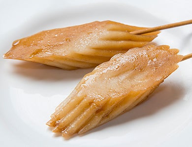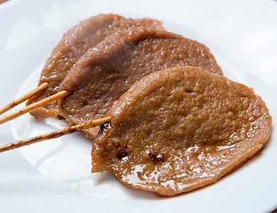 白焼とはスケトウダラのすり身の素焼きのことです。白焼きというだけあり、本来は白い色をしているのですが、静岡おでんの濃い味のダシをたっぷり吸い込んで真っ黒になります。淡白な味わいで、ふわふわもちもちの食感。噛むほどにたっぷり染みたダシの旨みがじゅわっと口に広がります。ヘルシーで人気の一品です。