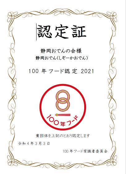 全国の多様な食文化の継承・振興を図るため、各地で受け継がれ愛されている食文化を掘り起し、100年続く食文化として継承することを目指す文化庁の 「100年フード宣言」事業がスタート。全国から寄せられた申請について有識者委員会による審査が行われ、未来に残すべき地域の食文化として静岡おでんが認定されました。 静岡県内の認定は3件、静岡おでんは全国で15団体が選定された有識者特別賞も併せて受賞しています。