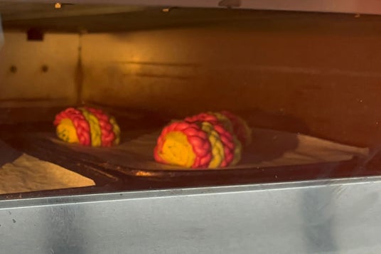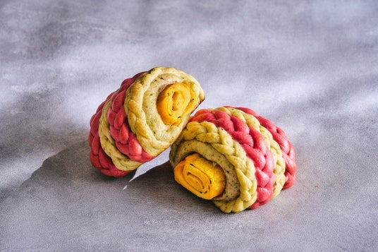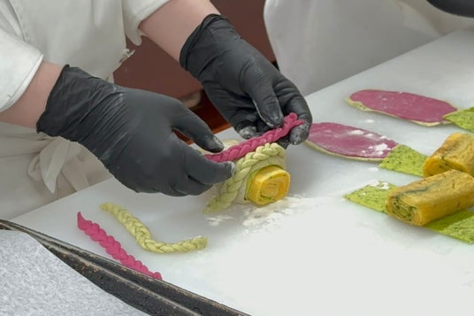 A:はじめからキュウリに勝算があったわけではありません。水分量が多く味も淡いキュウリは、パンに向かない素材だと感じていました。ただ、その弱点を欠点ではなく活用する発想に切り替えました。水分は生地の仕込み水として活用し、味の淡さは食感を残すことで「キュウリらしさ」として表現しました。ピューレ状にすることで水分量を正確に管理できたことも大きなポイントです。農家さんから学んだ時点で佃煮の使用は決めていましたが、それだけではパンとしてのインパクトに欠けるため、組み合わせる素材を模索し、だし巻き卵に辿り着きました。当ホテルは海外からのお客さまが多く、日本の方にも海外の方にも喜ばれるパンを目指しています。たまごサンドの人気をヒントに、日本らしさのあるだし巻き卵なら受け入れてもらえると考えました。結果として、キュウリの佃煮との相性は非常に良いものでした。今回の作品は「和」を軸に構成しています。生地にはおから、豆乳、あおさを使い、甘味にはみりんシロップを使用。具材も含め、全体を和の方向性で統一したことが相性の良さに繋がったのだと思います。見た目にもこだわり、だし巻き卵の黄色、キュウリとあおさの緑、ビーツのピンクで構成しています。一色ではなく、カラフルで視覚的にも印象に残る仕上がりを意識し、だし巻き卵はあえて大きめにして、しっかりとした存在感を持たせました。