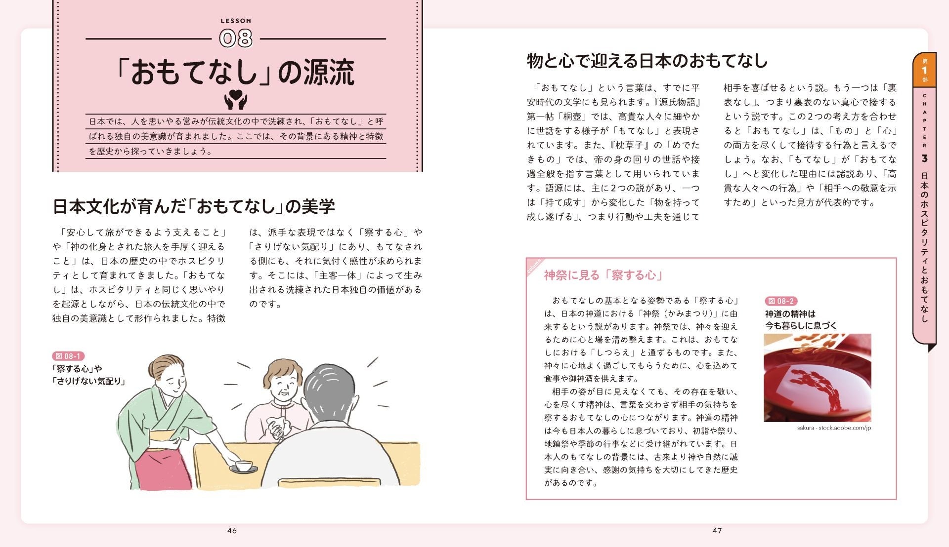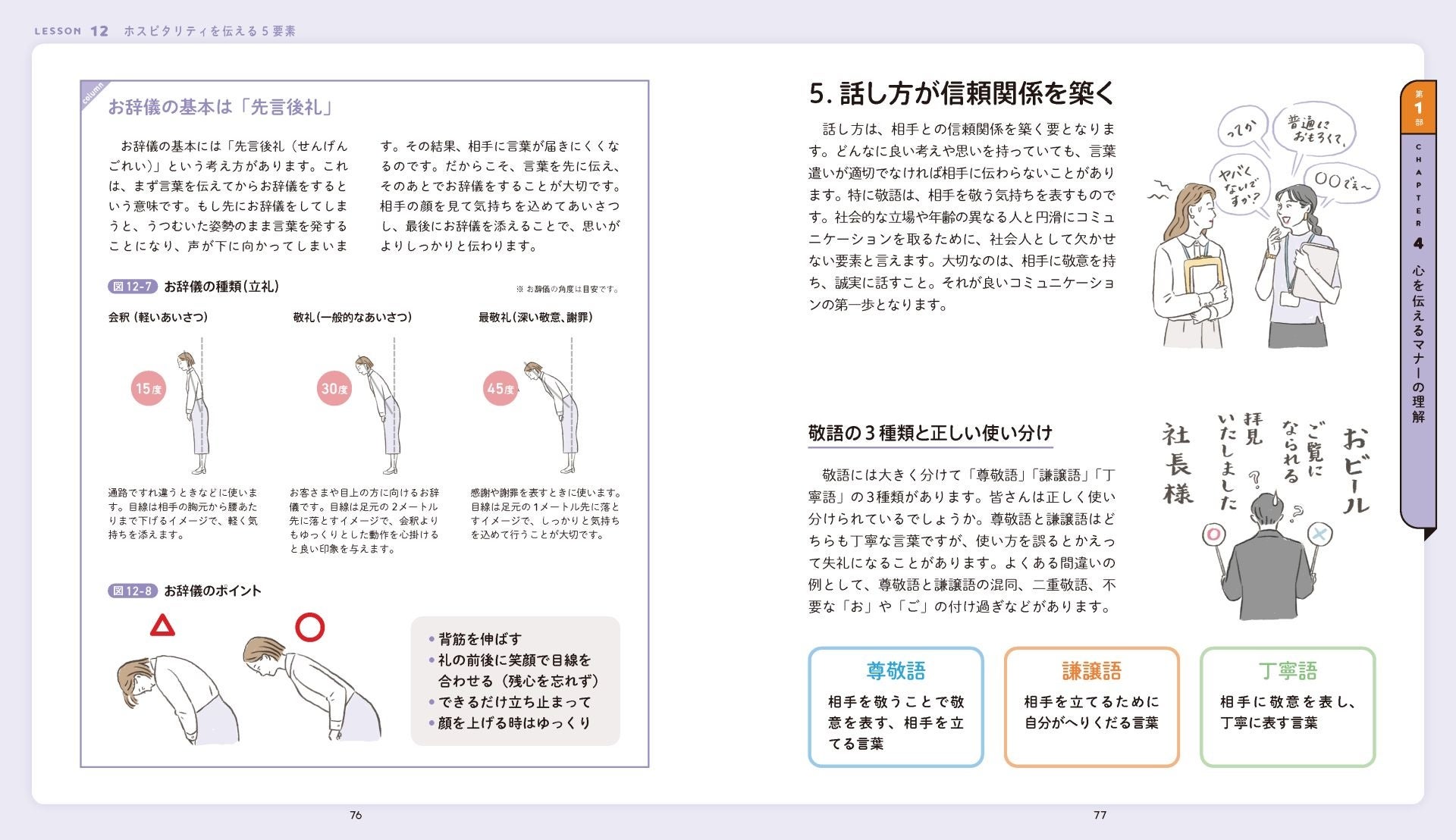本書は、日本航空が全国の大学で実施している「ホスピタリティ・マネジメント講座」をベースに書籍化したものです。 単なるマナーの解説にとどまらず、JALグループで大切にされている「察する心」や「2.5人称の視点(自分・家族・顧客という3つの視点の統合)」といった考え方を、具体的な事例とともに紹介しています。さらに、講義には含まれない書籍オリジナルのコンテンツとして、JALグループ社員の現場での体験談を紹介する「Voice」コラムや、社員ひとりひとりの行動や判断の指針になっている「JALフィロソフィ」の実践内容を深掘りしたコラムも多数収録しました。