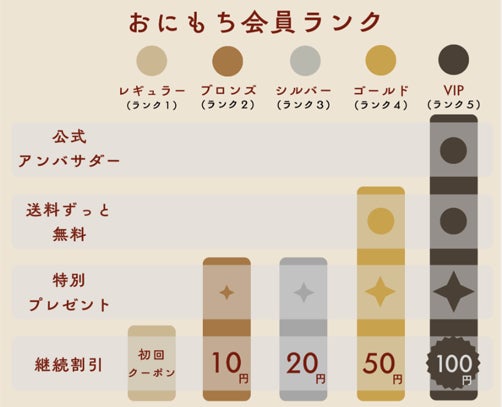 「おにもち会員ランク」では、購入回数や継続利用に応じて、ここでしか手に入らないオリジナルアイテムや商品特典をご用意しています。