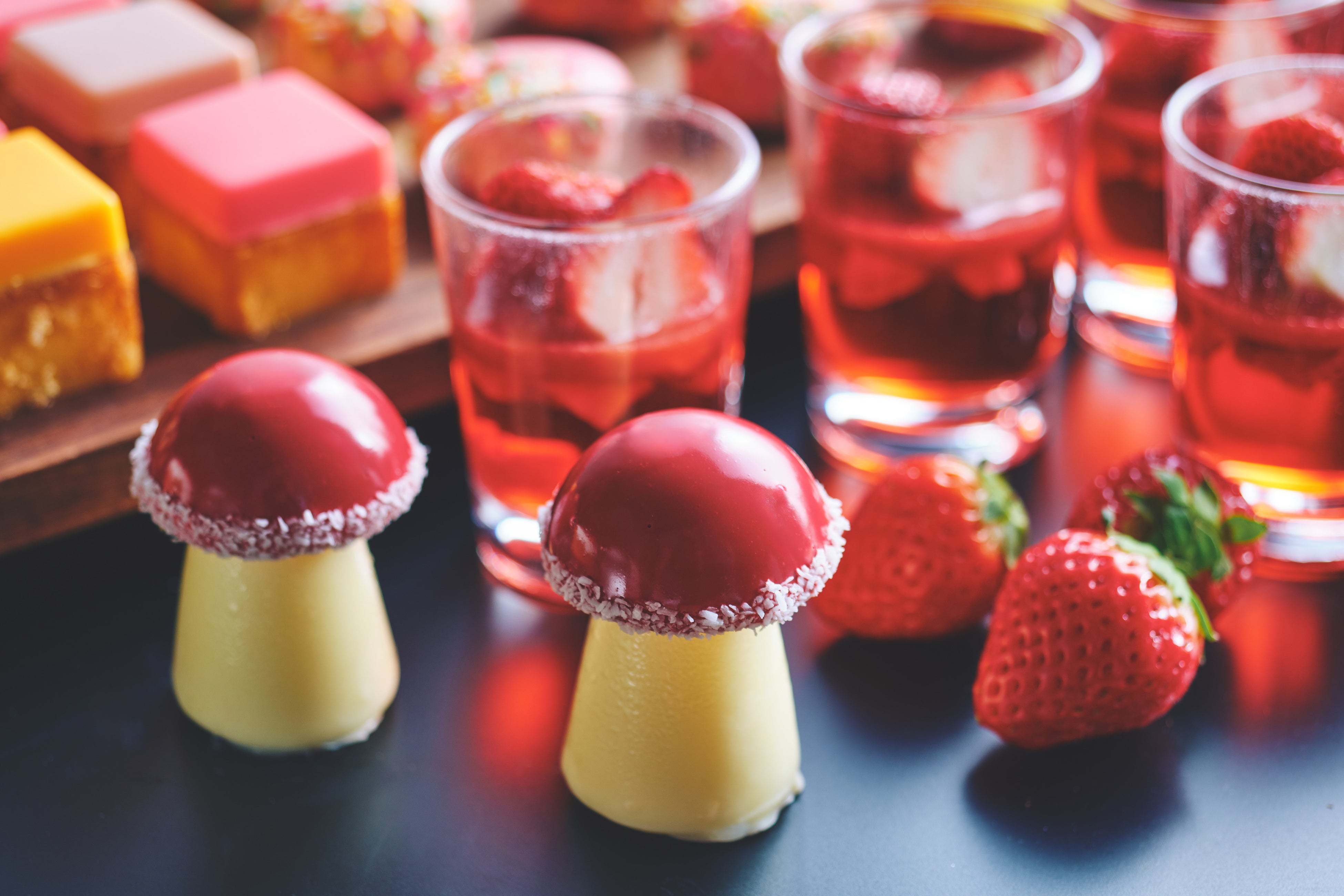 愛らしいキノコのフォルムが印象的な「ストロベリーマッシュルーム」は、ストロベリーとホワイトチョコレートのムースを、パリッとしたホワイトチョコレートで包み込んだ一品。お皿の上でもひと際映える、遊び心あふれるスイーツです。