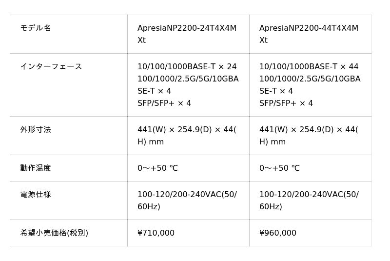 APRESIA Systems株式会社(本社 東京都中央区、代表取締役社長 末永 正彦)は、オフィスや校内LAN向けイーサネットスイッチ「ApresiaNP2200-24T4X4MXt」と、「ApresiaNP2200-44T4X4MXt」の2機種を2026年4月から販売開始予定です。