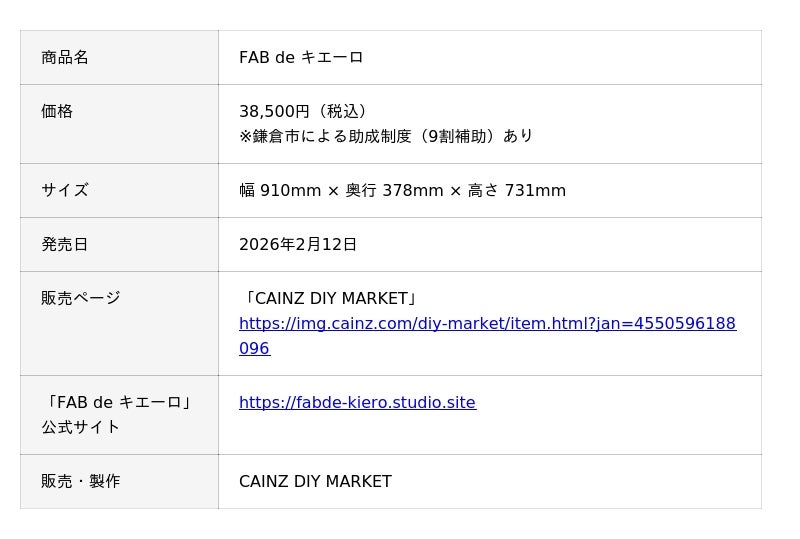本製品は2026年2月12日(木)より、カインズが運営するDIYプラットフォーム「CAINZ DIY MARKET」において販売を開始します。価格は税込38,500円です(※2)。