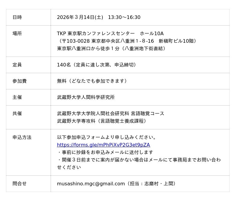 武蔵野大学人間科学研究所(所長:辻 惠介)は3月14日(土)に「第11回武蔵野言語聴覚カンファレンス」をTKP東京駅カンファレンスセンター(東京都千代田区)で開催します。