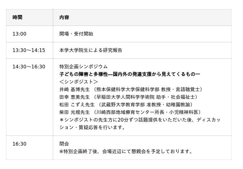 当日は、武蔵野大学大学院生による研究報告のほか、特別企画として子どもの発達障害の分野で活躍する専門家4名をシンポジストに招いて、「子どもの障害と多様性―国内外の発達支援から見えてくるものー」と題したディスカッションを行います。人間科学に関心を持つ大学生・大学院生をはじめ、一般の方々に向けてそれぞれの知見を語ります。