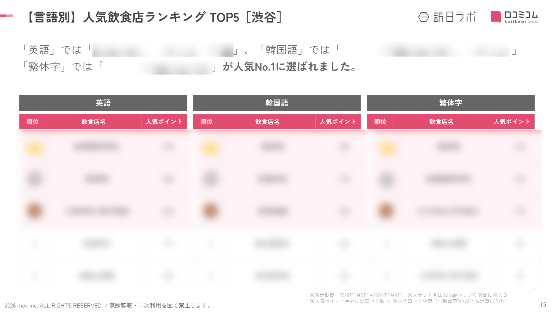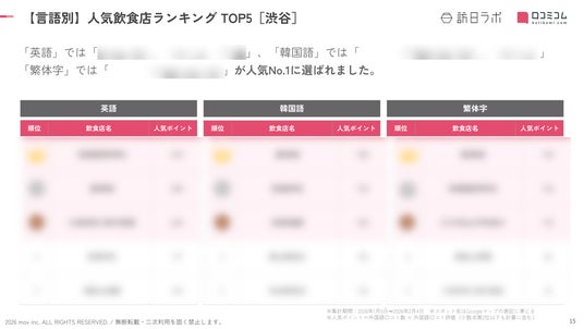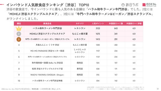 業界最大級のインバウンドビジネスメディア「訪日ラボ」及び 店舗向け集客一元化プラットフォーム「口コミコム」を運営する株式会社mov(代表取締役:渡邊 誠、本社:東京都渋谷区、以下mov)は、渋谷の飲食店に寄せられた最新の口コミデータから、独自の『インバウンド人気飲食店ランキング』を発表しました。