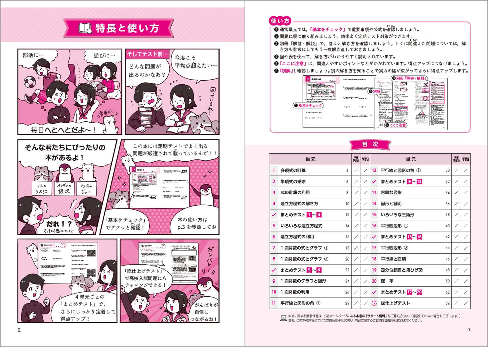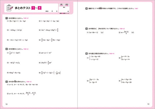 いろいろなパターンの問題を掲載しているので、定期テスト対策にぴったり。理解できたか確認できる「まとめテスト」を数単元に1回掲載して、はずせない基本問題を効率よくマスターしていきます。