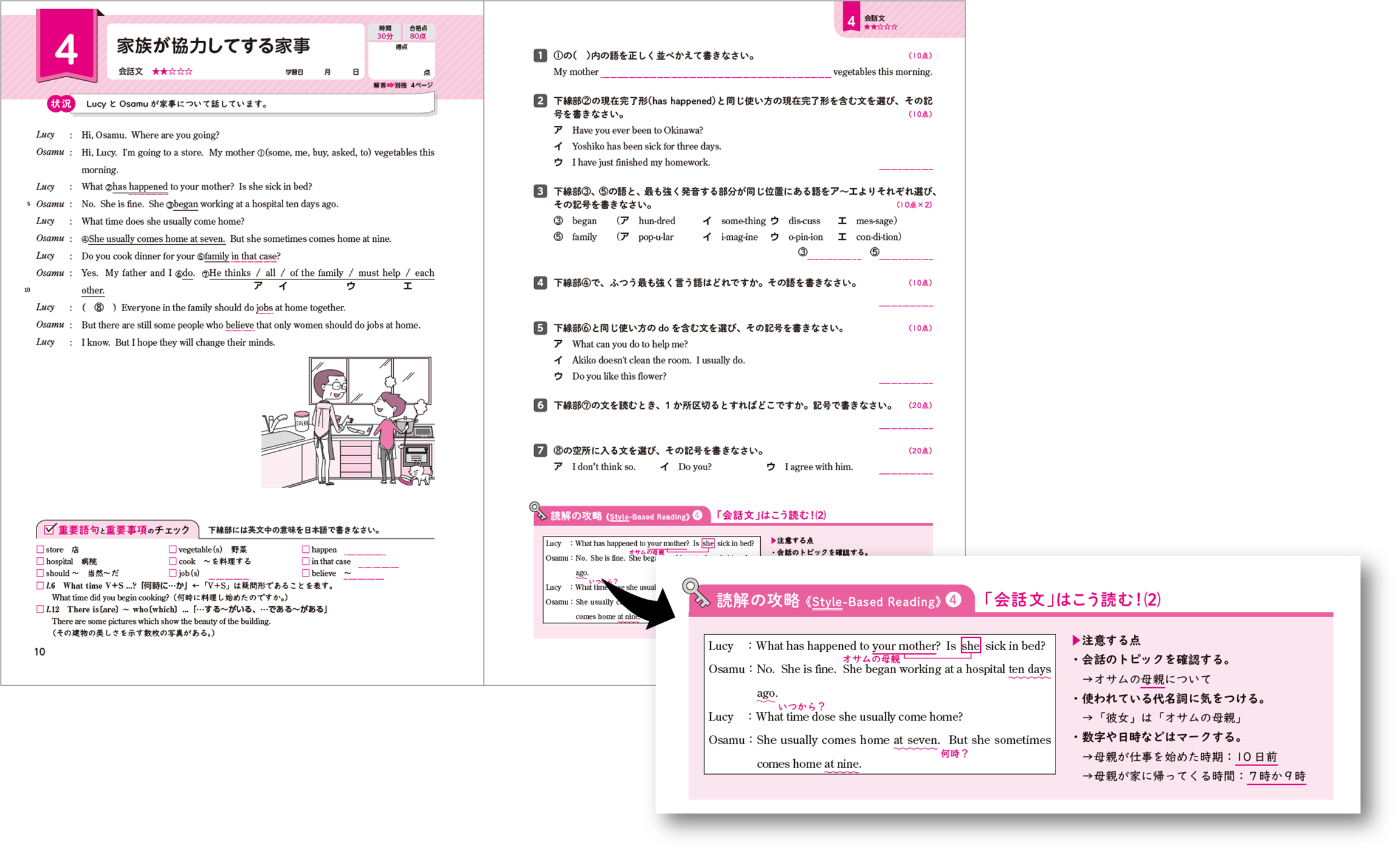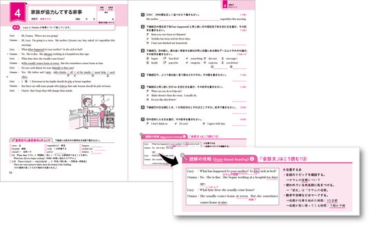 ▶1単元は2~3ページ構成。身近なテーマを取り上げた文や会話文を読みます。