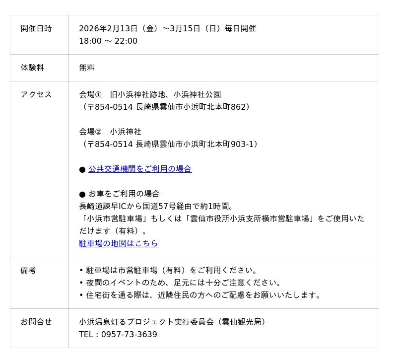 小浜温泉灯るプロジェクト実行委員会(長崎県雲仙市)は、2026年2月13日(金)から3月15日(日)までの期間、小浜温泉街を舞台に「小浜温泉灯るプロジェクト~第2弾 灯りと巡る夜の小浜温泉~」を開催いたします。