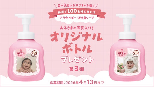 サラヤ株式会社(本社:大阪/代表取締役社長:更家悠介)は、お子さまの写真が入ったアラウ.ベビー泡全身ソープオリジナルボトルが100名様に当たるキャンペーンを2026年2月12日(木)から開始することをお知らせします。
