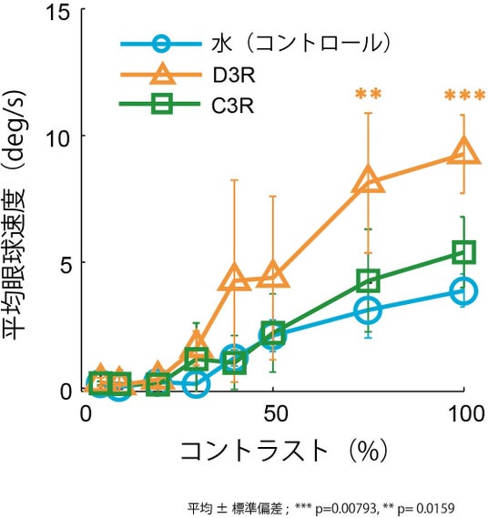 アントシアニン単体(D3R, C3R)を直接経口投与した実験では、D3R(デルフィニジン-3-ルチノシド)を投与した群が、対照群(水)と比較してコントラスト感度が最も有意に改善しました。C3R群にはD3Rほどの顕著な改善は見られませんでした。