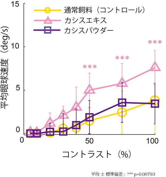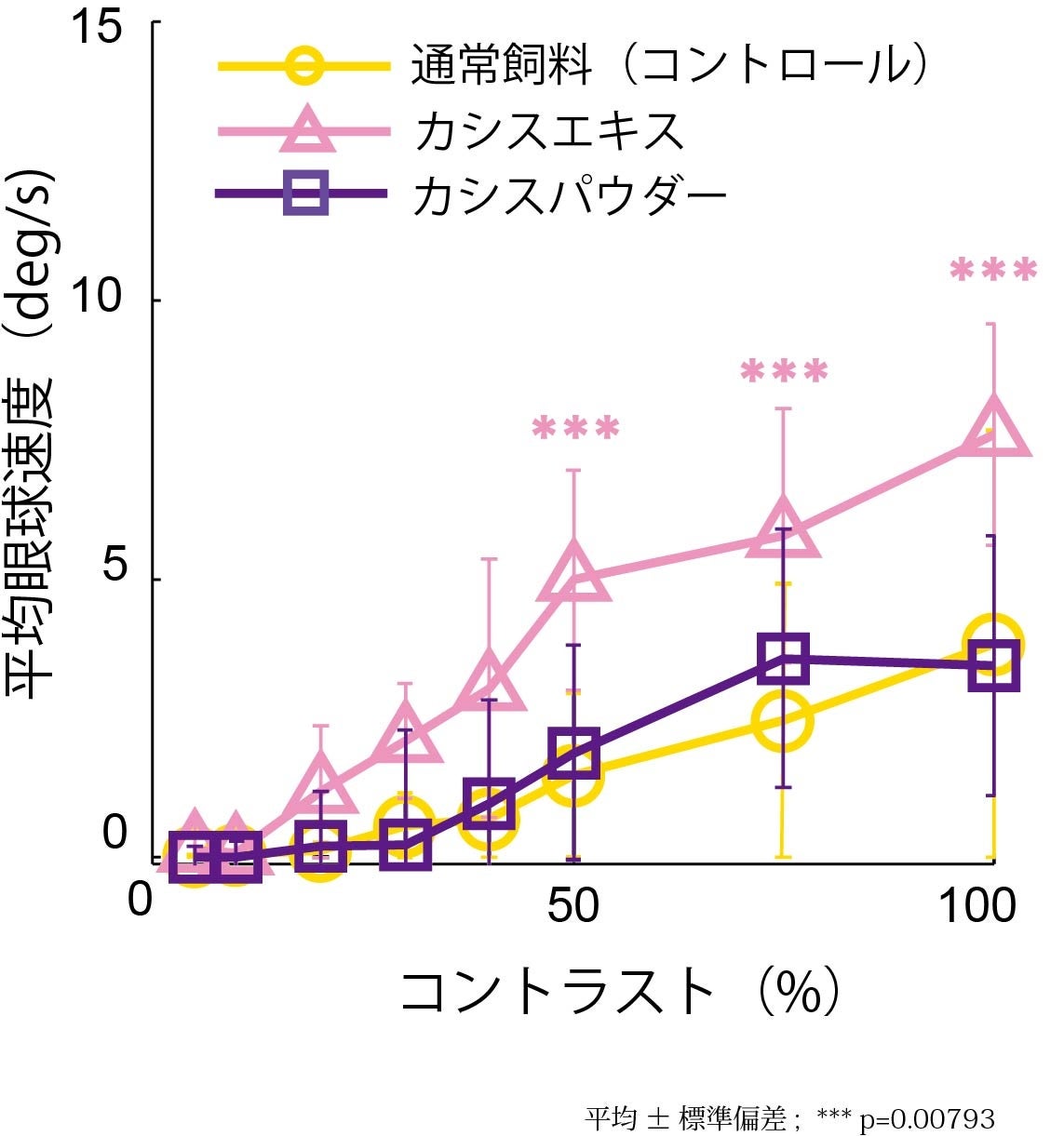 カシスエキスを投与した群は、通常の飼料 投与群と比較して、明暗の差(白黒)を見分ける能力である「コントラスト感度」が有意に改善しました。一方、カシスパウダー群では、カシスエキス群ほど顕著な改善は見られませんでした。