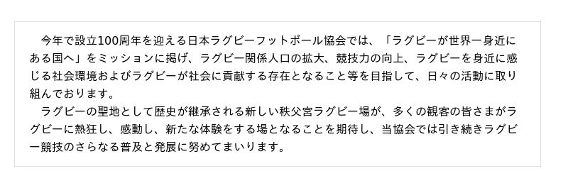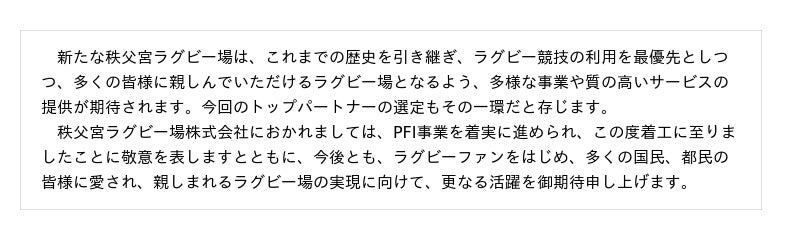 副名称は、正式名称「新秩父宮ラグビー場※」とは別にPFI事業において事業者の安定的な施設運営と魅力向上を図る観点から、ネーミングライツとして付与が認められています。正式名称の使用はもとより、ラグビー場の多様な利活用の場面に応じて副名称も使用してまいります。