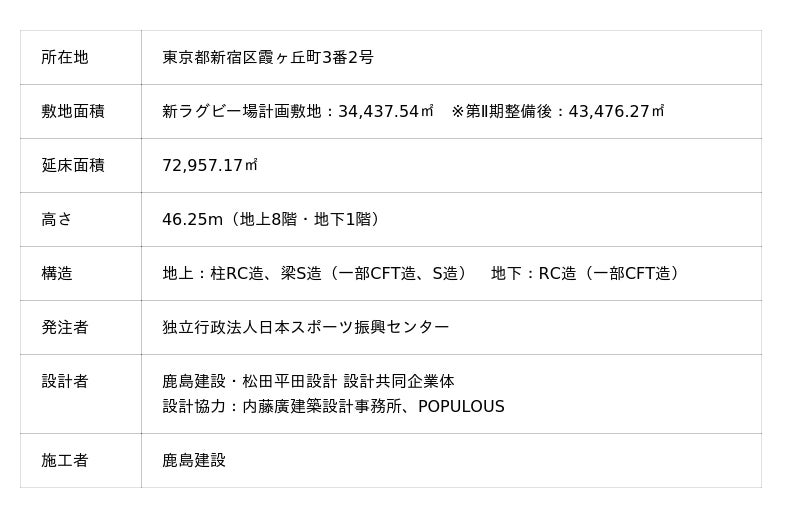 本施設は、地上8階地下1階建・延床面積約73,000平方メートル 、収容人数ラグビー利用時約1.5万人、イベント開催時最大約2.5万人の、都内でも有数の好立地に位置した屋内全天候型多目的ラグビー場です。本事業は「民間資金等の活用による公共施設等の整備等の促進に関する法律」(PFI法)に基づき行われ、事業者は施設等の設計、建設を行った後、独立行政法人日本スポーツ振興センター(以下「JSC」という)に本施設等の所有権を移転すると同時に本施設の公共施設等運営権を取得し、30年間の運営・維持管理を行います。