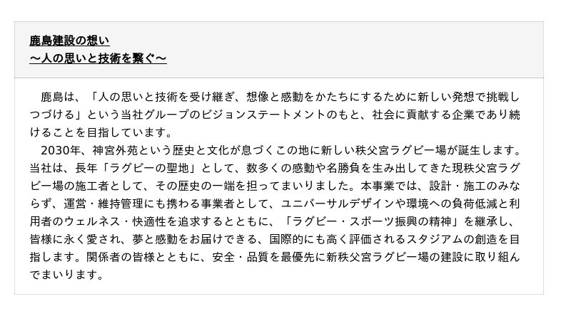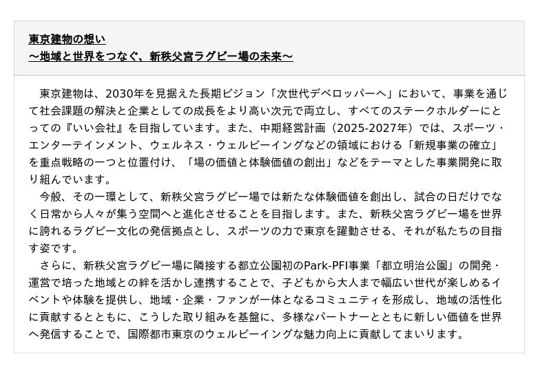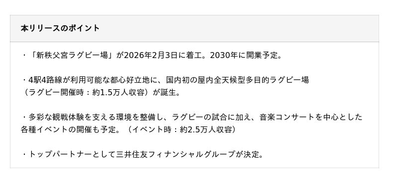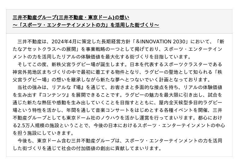 鹿島建設株式会社(本社:東京都港区、代表取締役会長兼社長:押味 至一)を代表企業として、三井不動産株式会社(本社:東京都中央区、代表取締役社長:植田 俊)、東京建物株式会社(本社:東京都中央区、代表取締役社長執行役員:小澤 克人)、株式会社東京ドーム(本社:東京都文京区、代表取締役社長 COO:長岡 勤)の4社が構成企業となる「秩父宮ラグビー場株式会社」は、東京都新宿区において収容人数約1.5万人(ラグビー開催時)、約2.5万人(イベント時)の屋内全天候型多目的ラグビー場である「新秩父宮ラグビー場」を2026年2月3日に着工したことをお知らせします。