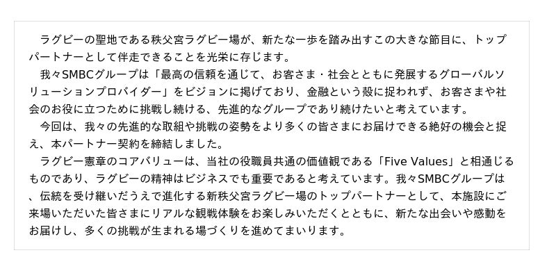 日本を代表する金融機関であることはもちろん、スポーツ、特に「ラグビー」へのスポンサーシップ、また環境に対する取り組みもこれまで多大なる実績をお持ちであるSMBCグループが、新しい秩父宮ラグビー場のトップパートナーに決定いたしました。