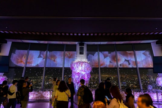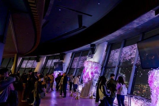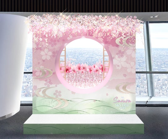 地上350メートルの天望デッキでは、日本らしいモチーフを取り入れた桜の装飾やフォトスポットが登場。地上では体験できない、目の前に広がる眺望と桜を写真に収めることができます。