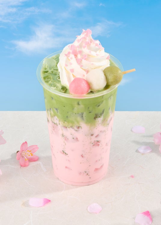 いちごミルクと抹茶ミルクを重ねた、春色のドリンク。ふんわりホイップに三色だんごを添え、見た目も楽しい、デザート感覚の一杯です。
