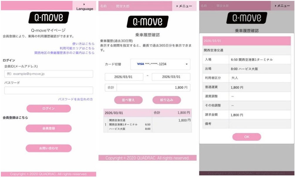 QUADRACの「Q-move」サイト(URL: https://q-move.info/ )にアクセスし、マイページの会員登録手続きが完了しますとタッチ決済履歴の確認が可能となります。