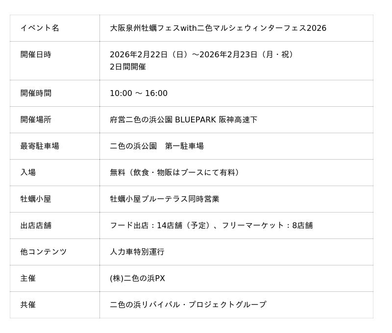 府営二色の浜公園BLUE PARKは冬の恒例人気グルメイベントとして「大阪泉州牡蠣フェスwith二色マルシェウィンターフェス」を開催いたします。