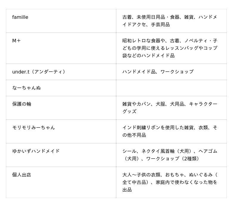 衣類・雑貨・ハンドメイド商品・日用品など、掘り出し物が見つかるブースが並び、グルメだけでなくショッピングも楽しめる内容となっています。