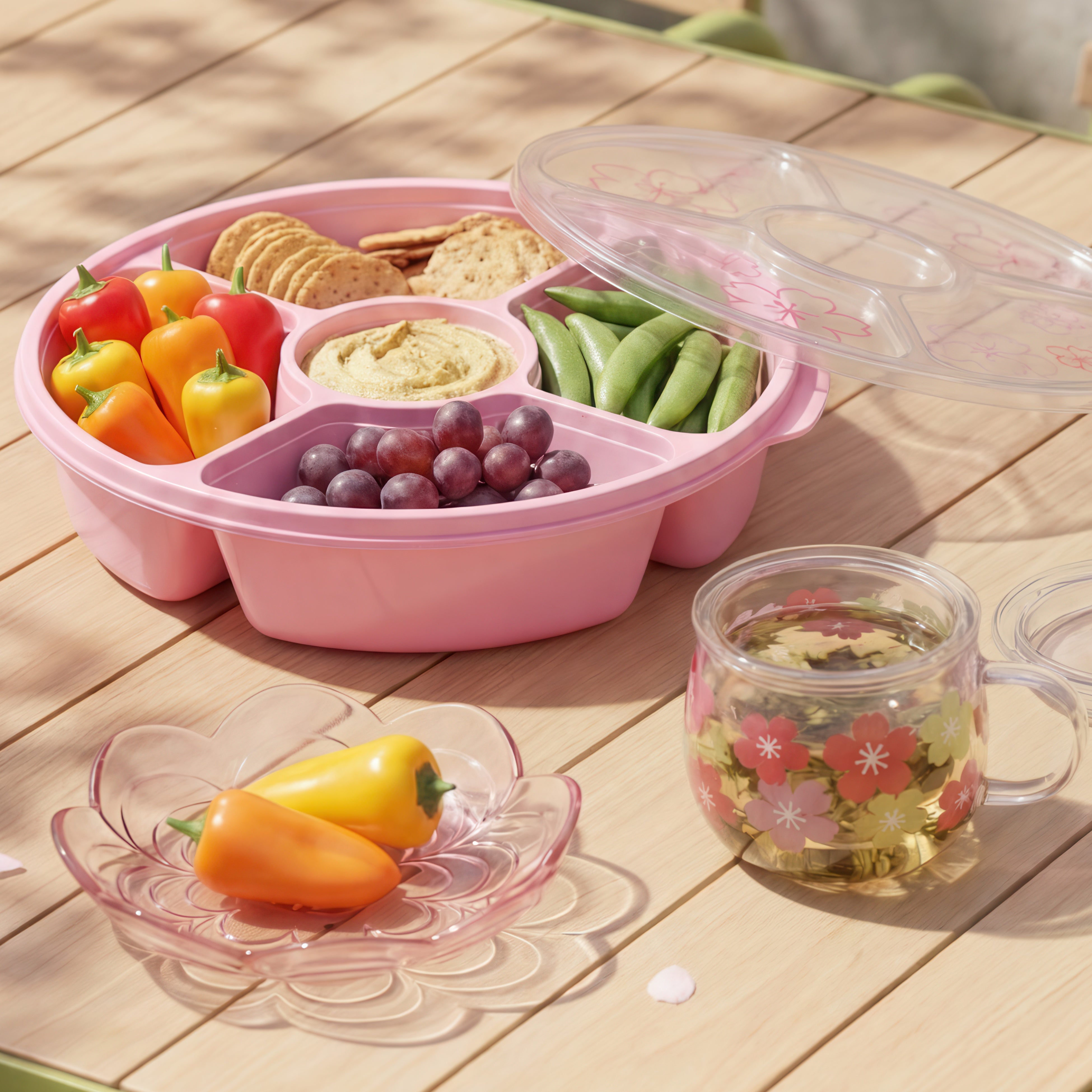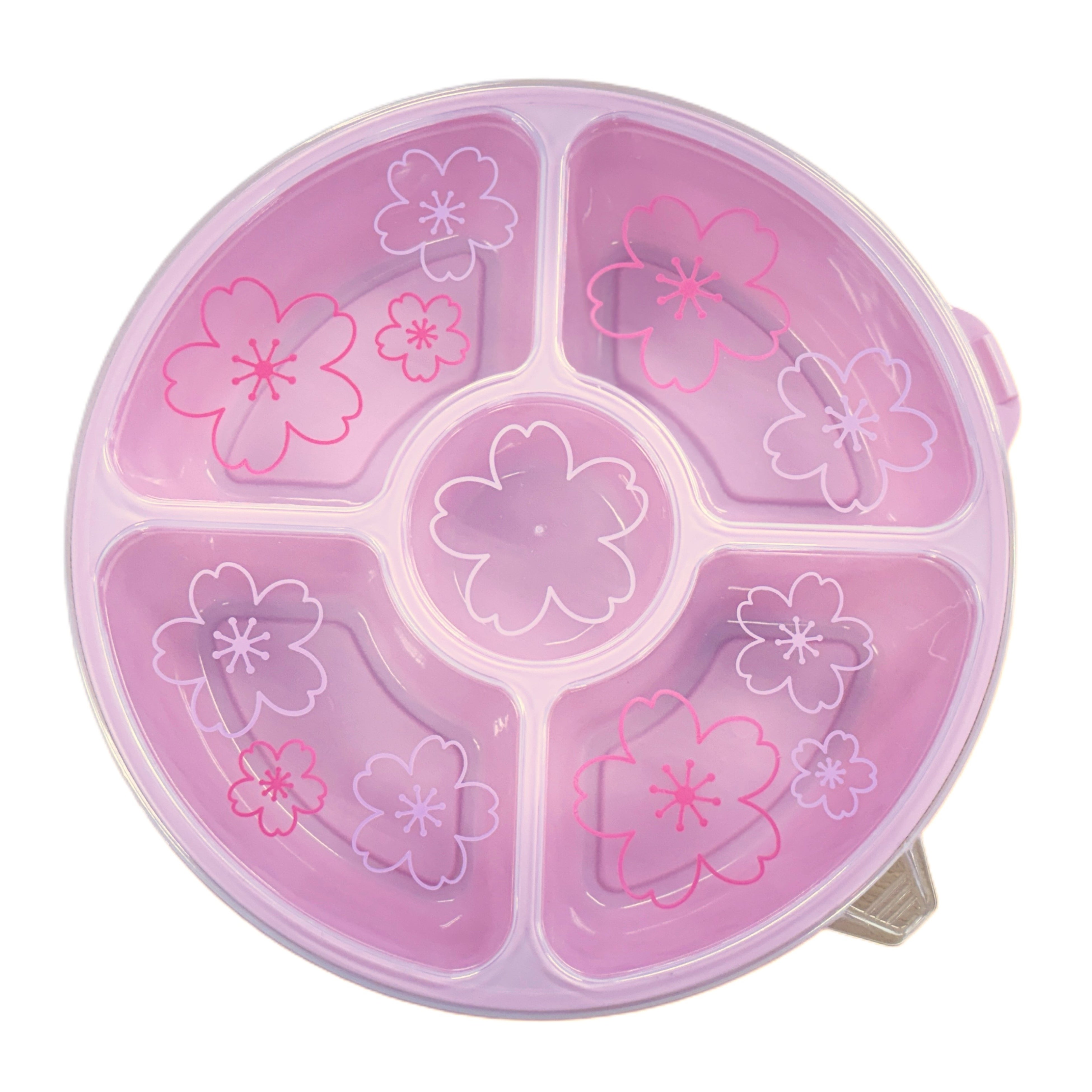 深さ6.5cm、直径27.5cmと大き目サイズのコンテナには、5つの仕切りが。たっぷりお惣菜やお菓子をつめこんで!