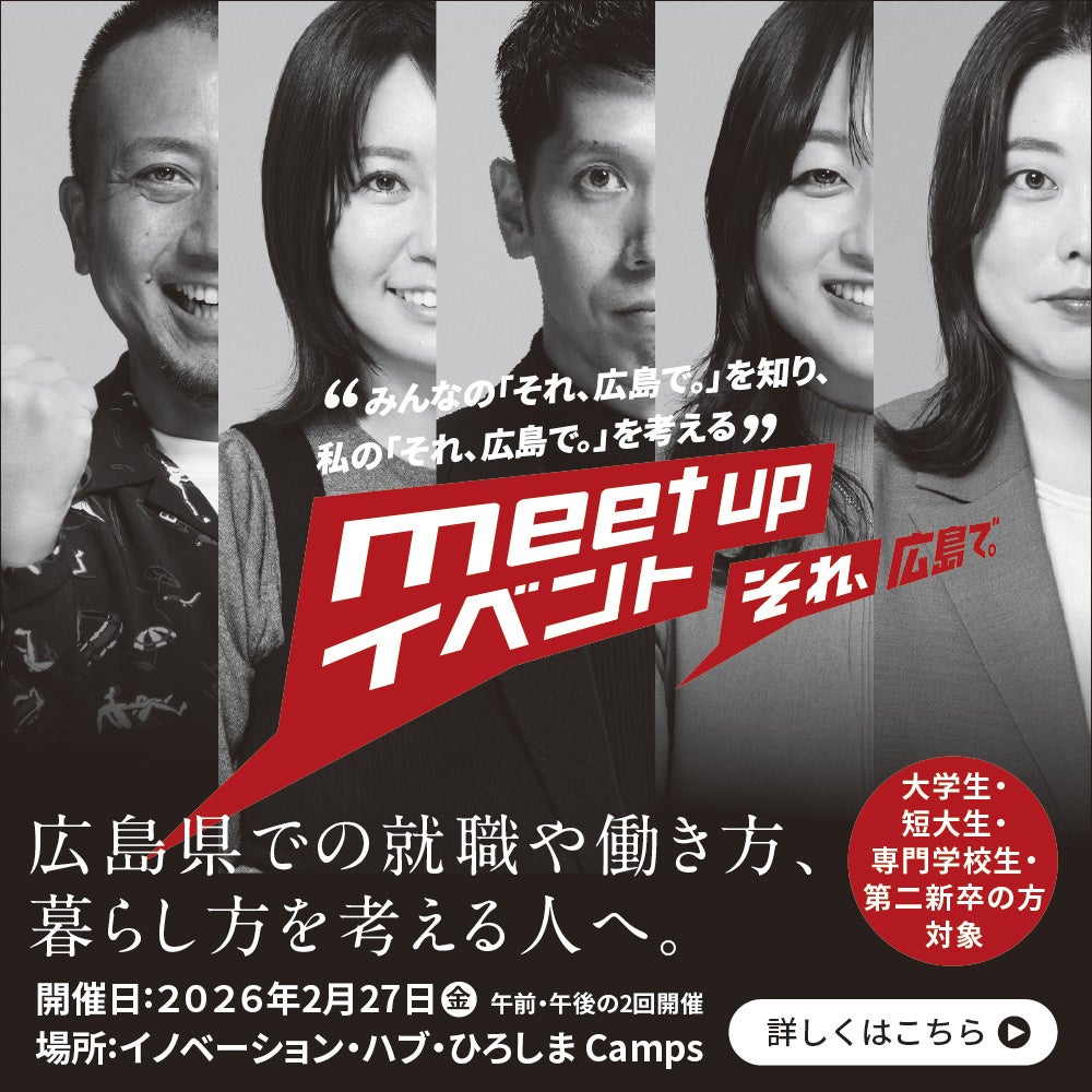 2026年2月27日(金)には、アンバサダーたちと就職活動中の学生や転職を考えている第二新卒層の方との交流会「meet up イベント「それ、広島で。」」を開催します。「理想とする暮らしや働き方は、どこで実現できるのだろうか。」