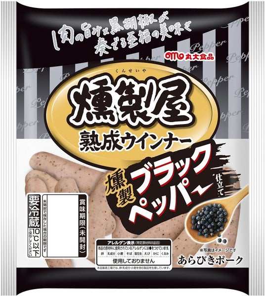 燻製屋ウインナーのジューシーな肉の旨みに深みと複雑な風味が特長の燻製黒胡椒を配合し、夕食やおつまみにもぴったりな大人の味わいに仕上げました。また、黒胡椒をより感じていただけるようにスモーク感を調整しました。