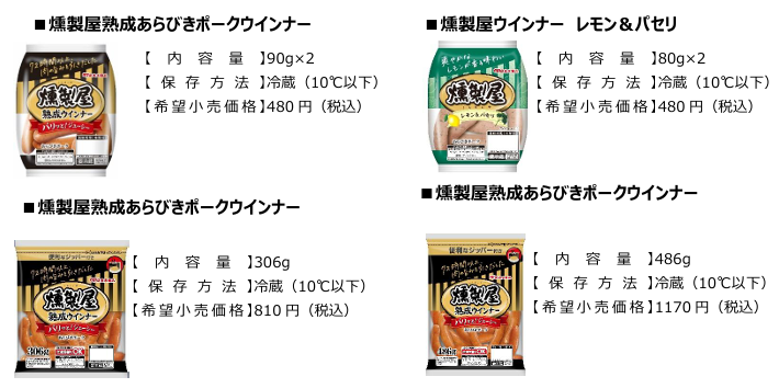 燻製屋熟成ウインナーは、原料肉に豚肉のみを使用し、でんぷんなどの結着材料は一切使用していない、業界で初めて特定JAS(現特色JAS)に認定されたウインナーです。発売30周年を迎えた今期は、フレーバー商品として展開した「燻製屋ウインナー レモン&パセリ」が多くのお客様からご好評を得ることができ、さらに映画タイアップなど様々な施策を行うことで燻製屋シリーズ全体の伸長につながりました。来期は燻製屋シリーズのさらなる売上拡大に向け、燻製屋ウインナーの【ジューシーな肉の旨み】と【人気のフレーバー】を掛け合わせた新商品を発売いたします。