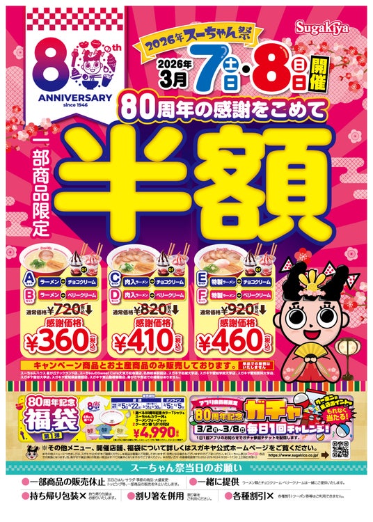 スガキコシステムズ株式会社(本社:愛知県名古屋市、代表取締役社長:菅木伸一)が運営する「スガキヤ」は、おかげさまで創業80周年を迎えます。長年のご愛顧の感謝もこめて、最初の周年キャンペーンとして2026年3月7日(土)8日(日)の2日間、人気商品のセットを半額でご提供する「スーちゃん祭」「寿祭(ことぶきさい)」を同時開催いたします。