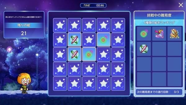 見本として用意された星座の図案を参考に、画面上の星と星をつなげて星座を完成させましょう。メイプルキノコやイエティなど、メイプルキャラクターたちの星座を完成させることで、イベントコインや「疾風の成長の秘薬」などのアイテムを獲得できます。