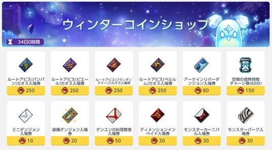 ウィンターコインショップ第2弾がオープンしました。各イベントで集めたイベントコインを使用して、「永遠の転生の炎」や「強力な転生の炎」、「光るアクセサリースタフォ拡張石」などの強化・消費アイテムなどと交換することができます。