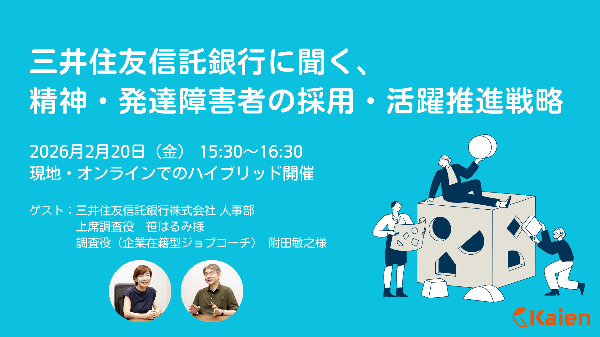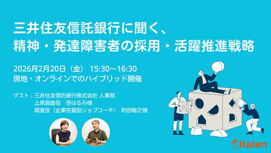 精神障害・発達障害の方への就労支援と、企業における障害者雇用のコンサルティング事業を展開する株式会社Kaien(本社:東京都新宿区、代表取締役:鈴木慶太、以下Kaien)は、三井住友信託銀行株式会社(以下、三井住友信託銀行)の人事部担当者をゲストに招いた無料セミナー「三井住友信託銀行に聞く、精神・発達障害者の採用・活躍推進戦略」を、2026年2月20日(金)に開催いたします。