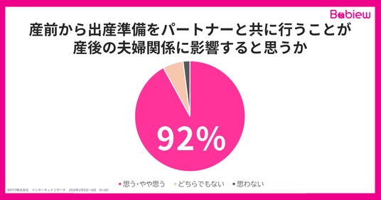 「産前から準備を共に行うことが、産後の夫婦関係に影響する」と答えた人は92%。べビューから始める出産準備が、パートナーとの絆を強くし、ママとパパになる意識をともに高め、産前・産後クライシスの防止に貢献していくよう、これからもより使いやすいサイト運営を目指します。