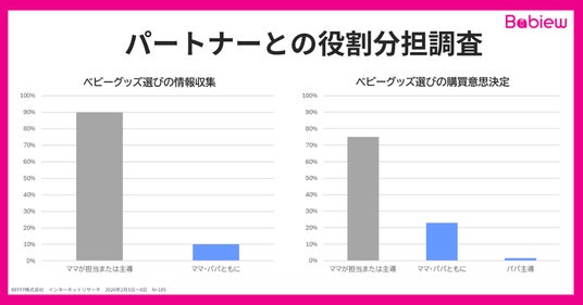 - ベビーグッズ選びに悩んだ人は95%! 理由は「何を信用していいか分からない」が最多。- ベビーグッズの情報収集の“ママ任せ”が浮き彫りに。ママ主導が約90%に対し、夫婦共同はわずか10%。