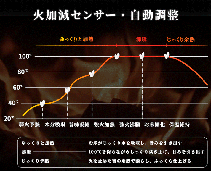 熱設計と蓄熱構造が相まって、一般的な電気炊飯器とは異なるふっくらもちもちの食感と、お米本来の甘み・香りを引き出す炊き上がりを可能にしています。特徴9:自動温度センサー制御
