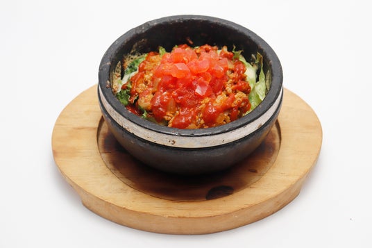 酸味の中にコクのあるトマトソース、スパイシーでほど良い辛味のタコスミートそしてワカモレのタコライスをアツアツの石焼でどうぞ!