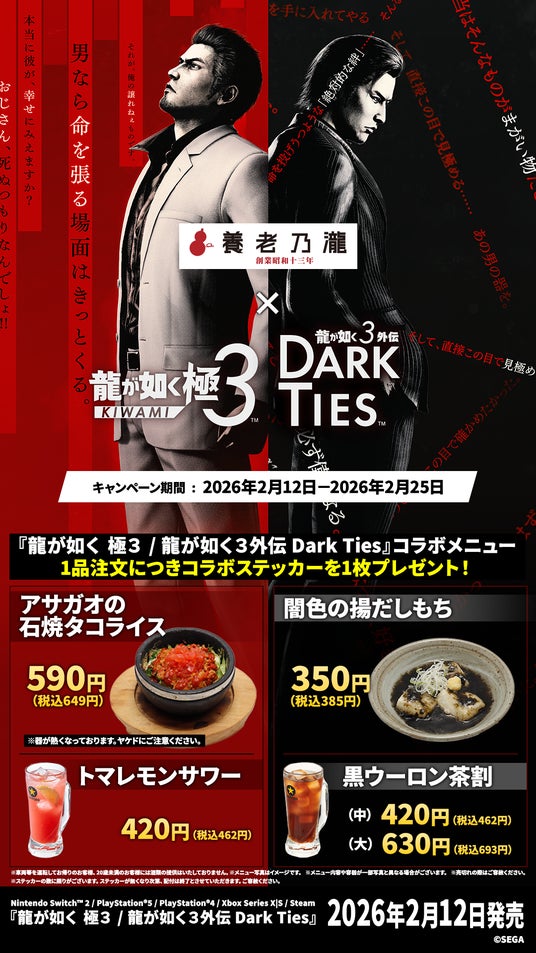 養老乃瀧株式会社(本社:東京都豊島区、代表取締役社長:矢満田 敏之)は、株式会社セガ(本社:東京都品川区、代表取締役 社長執行役員COO:内海州史)より本日発売の『龍が如く 極3 / 龍が如く3外伝 Dark Ties』とのコラボレーションキャンペーンを養老乃瀧と一軒め酒場の対象の店舗で2026年2月12日(木)~2026年2月25日(水)の期間に開催をいたします。養老乃瀧は本コラボでも様々なメニューをご用意して皆さまのご来店をお待ち申し上げております。また、養老乃瀧は最新作のゲーム内にも登場します。是非、リアルでもゲームでも養老乃瀧グループ店舗での居酒屋ライフをお楽しみください。