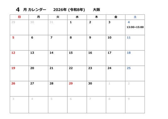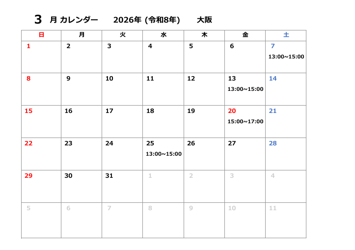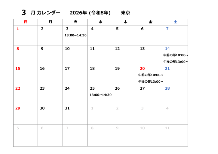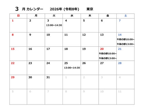 3月3日・3月14日(午前/午後)・3月20日(午前・午後)・3月25日・4月1日・4月11日(午前・午後)・4月14日・4月24日・4月29日(午前・午後)