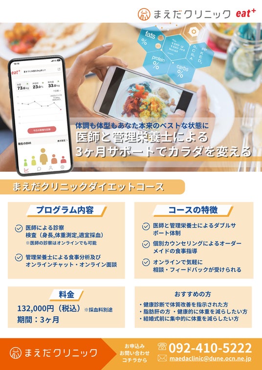 eatas株式会社(本社:福岡市中央区、代表取締役:手嶋英津子)は、医療法人海陽会まえだクリニック(本院:福岡市東区、理事長:前田正彦)のダイエットコース内にてeat+の食事指導サービスの提供を開始します。