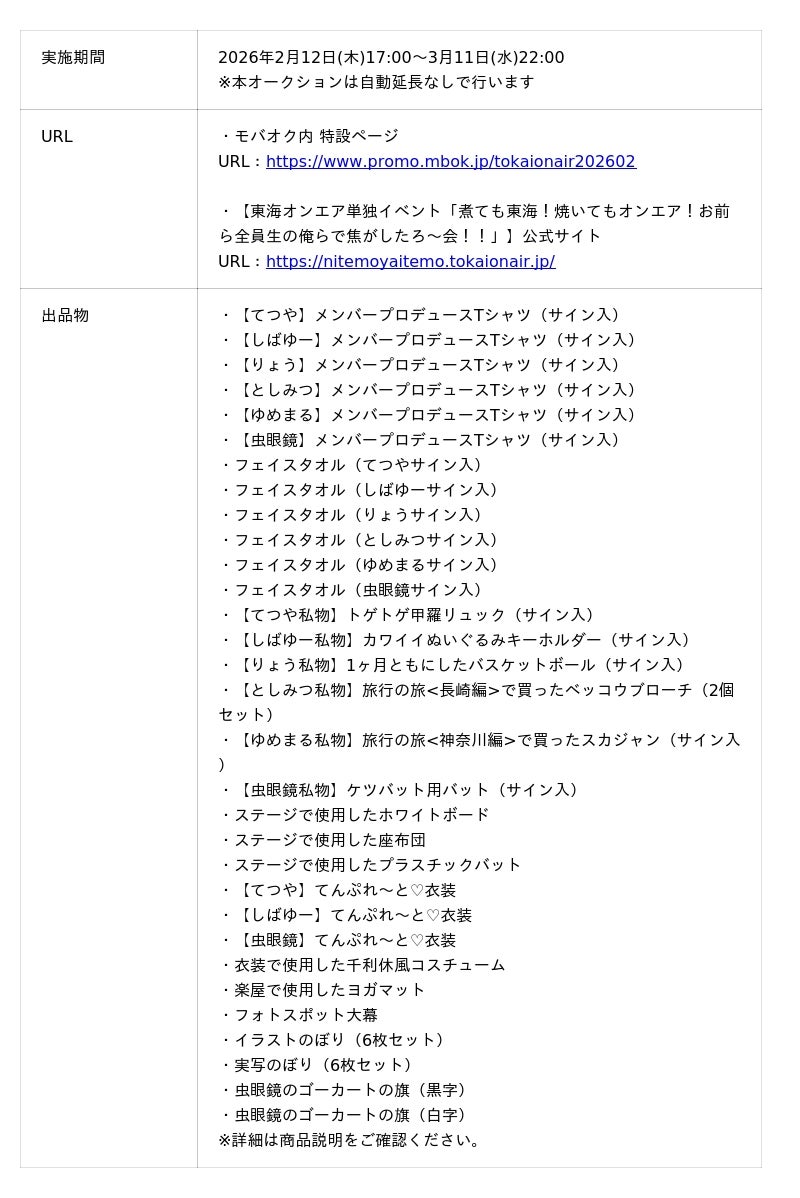 UUUM株式会社が主催する【東海オンエア単独イベント「煮ても東海!焼いてもオンエア!お前ら全員生の俺らで焦がしたろ~会!!」】(2026年2月11日開催)と連動し、株式会社モバオク(本社:東京都渋谷区、代表取締役社長:小一原 宏樹、以下モバオク)が運営するオークションサービス「モバオク」にて、チャリティーオークションを2026年2月12日(木)より開催いたします。