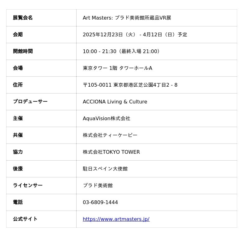 株式会社The Chain Museum(本社:東京都渋谷区、代表取締役:遠山正道、以下「The Chain Museum」)は、2025年12月23日(火)~2026年4月12日(日)の会期、東京タワー 1階 タワーホールAで開催している「Art Masters: プラド美術館所蔵品VR展」にて、当社が運営するアート・コミュニケーションプラットフォーム「ArtSticker(アートスティッカー)」のチケット販売システムを導入開始いたしました。