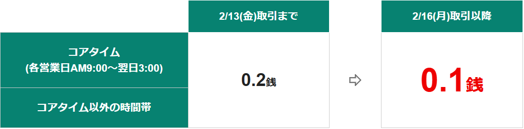 これまで当社では、米ドル/円の1,000通貨以内の成行(ストリーミング)注文・成行決済について、縮小スプレッド0.2銭を提示しておりましたが、2026年2月16日(月)(予定)取引分より、業界最狭の0.1銭に引き下げます。