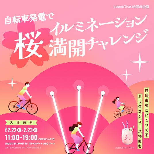 「エネルギーフリー社会の実現」をビジョンに掲げ、エネルギーと暮らしの新しいあり方を追求する株式会社Looop(本社:東京都台東区、代表取締役社長 CEO:中村創一郎、以下「Looop」)は、電力小売サービス「Looopでんき」の誕生10周年を記念し、2026年2月22日(日)・23日(月・祝)の2日間、渋谷サクラステージにて体験型イベント「サクラサク発電チャレンジパーク」を開催します 。10年間の感謝を込め、受験や新生活などの「挑戦」を控えた人々を、自転車をこぐエネルギーと連動した光の演出で応援します。高さ4mの桜イルミネーションを満開にする体験や、自転車をこいでつくる特製ミックスジュースなど、親子や友人をはじめ、どなたでも楽しめる特別な体験を無料で提供します。