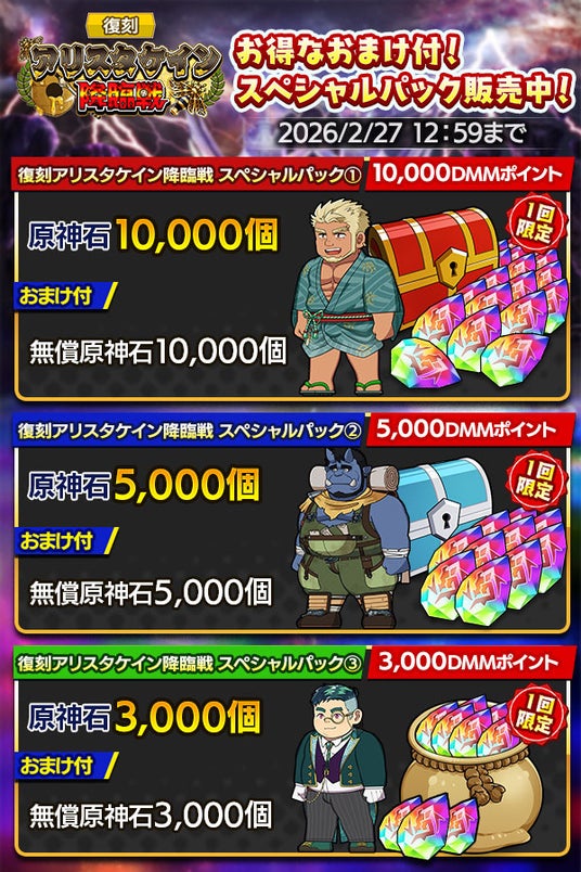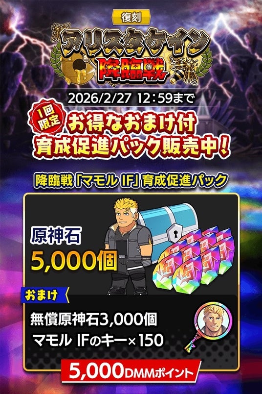 「復刻 アリスタケイン降臨戦」開催、「マモル IF」の登場を記念して原神石に加え、「マモル IFのキー」×150個が入手できてお得な「降臨戦「マモル IF」育成促進パック」と、「復刻アリスタケイン降臨戦スペシャルパック」も3種登場!こちらも是非お見逃しなく!