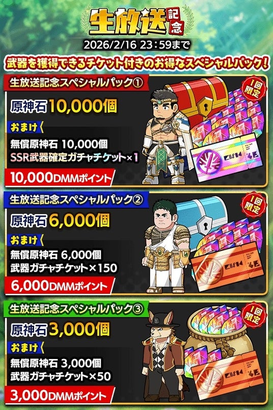 さらに、原神石に加え武器ガチャチケットが付いたオトクなスペシャルパックが3種登場!この機会をお見逃しなく!