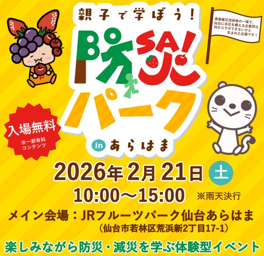 仙台ターミナルビル(株)(所在地/仙台市青葉区、代表取締役社長/松崎哲士郎)は、2026年2月21日(土)にJRフルーツパーク仙台あらはま・深沼うみのひろばにおいて、「親子で学ぼう!防災パークinあらはま」を開催いたします。