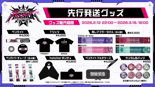 本公演開催に合わせ、本日2月12日(木)より秘密結社holoX Live 2026「First MISSION」ライブグッズが解禁されました。