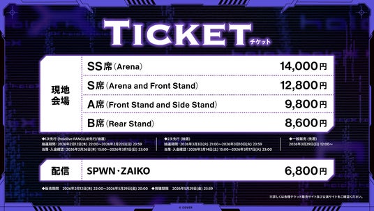 本日2月12日(木)より現地会場指定席チケットの1次先行(hololive FANCLUB先行 / 抽選)が開始とともに、「SPWN」「ZAIKO」にて配信チケットの販売が開始いたしました。